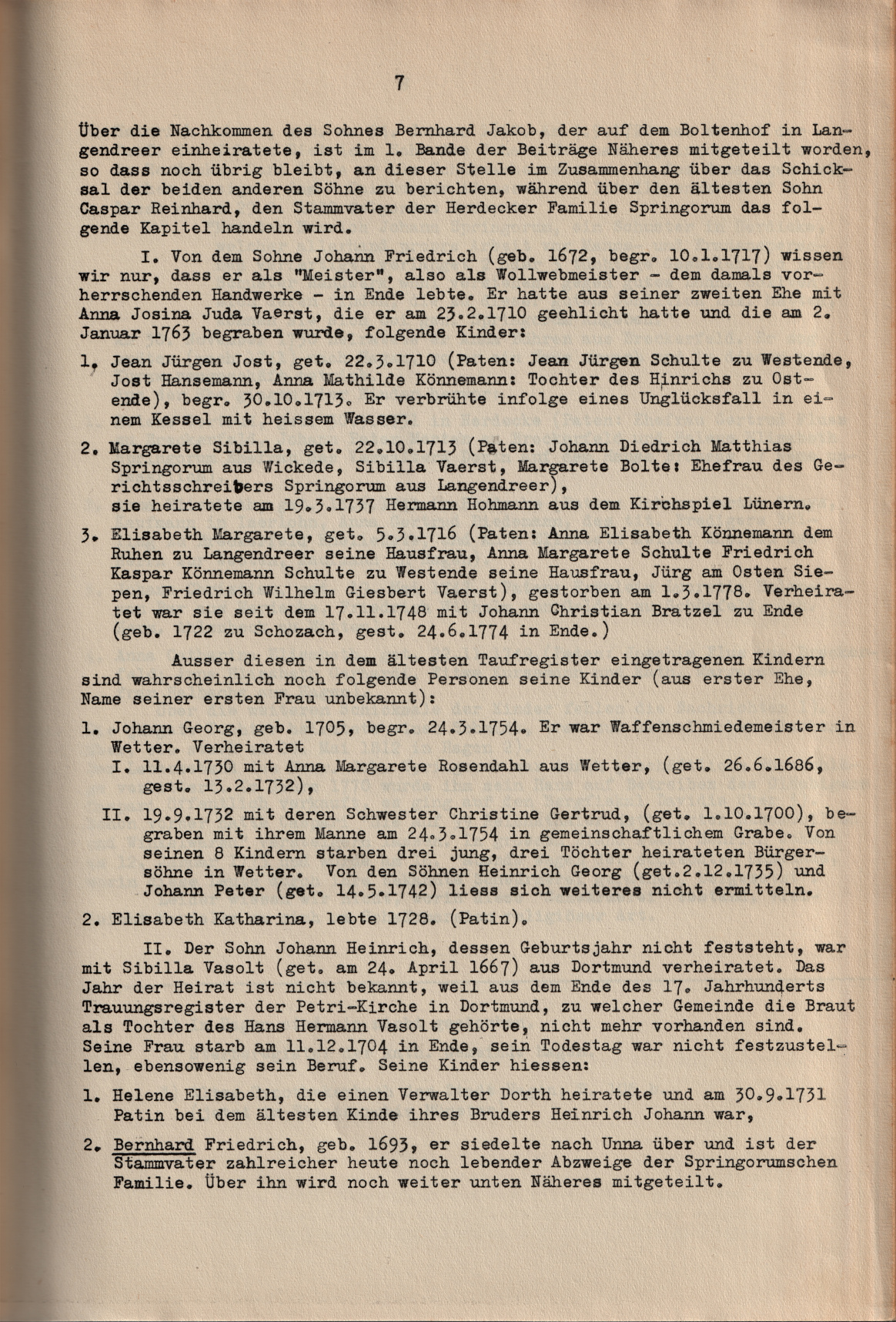 Anno 1742 8ten August ist getauft Josephus Bernhardus Henricus Springorum auß Johannes Josephus Springorum und Anna Maria Stratmans ihr ehelicher Sohn Die Gevattern: der wohlehrwĂŒrdige und wohlgeachtete Herr Harcorn, Johannes Bernhardus Wissing, und des Kindes Großvater Johann Heinrich Springorum, und dessen Großmutter Helena Herdinck, Ehefrau Springorum.