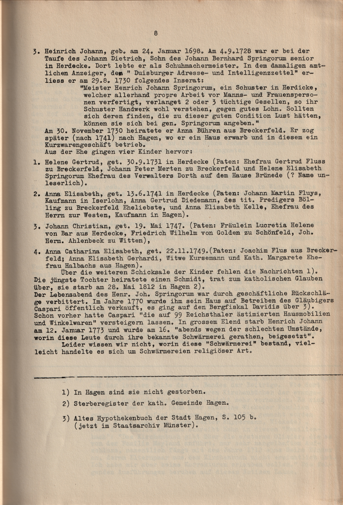 Source: Geschichte der Familie Springorum in der Zeit 1700 - 1800; Dr. Höfker; p.4
